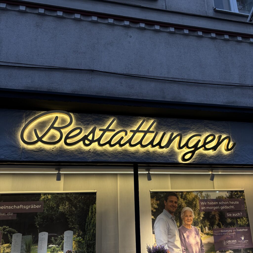 Verleihen Sie Ihrem Logo eine neue Dimension. 3D-Buchstaben und Profilbuchstaben sind die wohl eleganteste Art der Außenwerbung. Durch die plastische Wirkung entstehen spannende Schattenwürfe und eine hochwertige Optik, die flache Schilder nicht erreichen können. Ob aus edlem Edelstahl, farbigem Acrylglas oder mit indirekter ‚Corona-Beleuchtung‘ für einen schwebenden Effekt – wir bringen Ihr Logo in Bestform. Handwerkliche Präzision, die man fühlen und sehen kann.